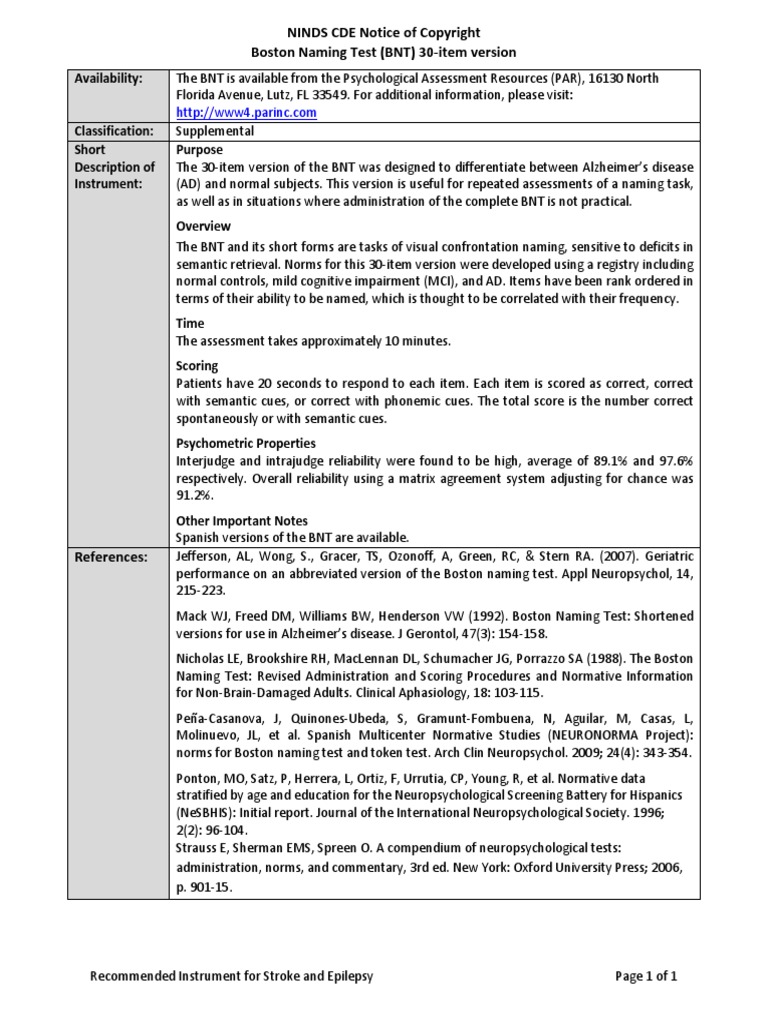 Boston Naming Test Bnt 30 Item Version Availability Classification Short Description Of Instrument Purpose Pdf Psychological Testing Medical Specialties