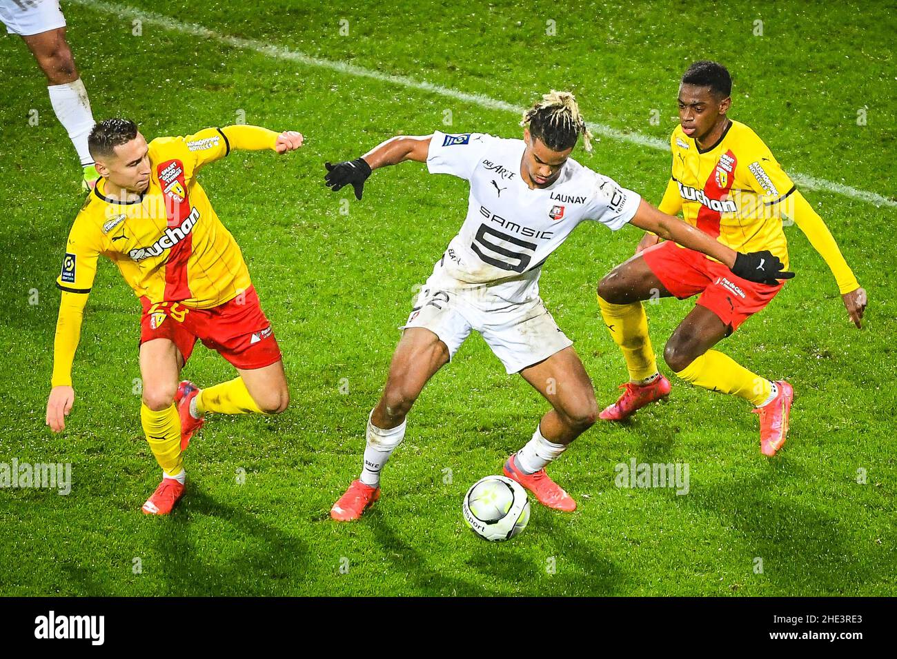 Lens France France 8th Jan 2022 Przemyslaw Adam Frankowski Of Lens Lorenz Assignon Of Rennes And David Pereira Da Costa Of Lens During The Ligue 1 Match Between Rc Lens And Stade